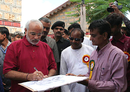 Shri. Narendra Modi is signing on the sketch made by Painter Ashok Jani
